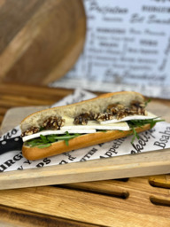 Broodje naar keuze belegd met carpaccio, rucolasla, truffelmayonaise, pada gradano en pijnboompitjes, Zout & Peper.