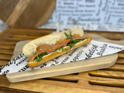 Broodje naar keuze belegd met zalm over een laagje roomkaas met rucola sla.