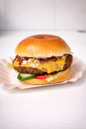 Zachte witte bol met hamburger, Cheddar kaas, ijsbergsla, ui, tomaat, komkommer, crispy bacon, mayonaise en curry.